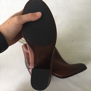 Brand New, never worn Frye Myra Bootie. Leather upper with lightly cushioned footbed. Redwood color. Fits true to size. Round toe. Pull-on. Lightly padded insole. 4" shaft height. 11" opening circumference. 3" heel. Available in size 9 and 6. Does not come w box. Perfect to wear with your comfiest jeans or your favorite dress.