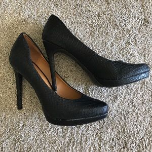 Oh yea, these pumps are so cute, classy yet sexy. Nice cushioned insole. The curve at the back of the shoe secures your foot. Sad to see them go, just to high for me. New without tags or box.