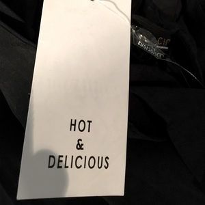 SALE🙌NWT Hot & Delicious Black "Chrissy Crepe Halter Jumpsuit ". Soft Non -sheer crepe adjustable halter neckline jumpsuit with side pockets and self -tie at waist . Wide leg full length pant . Elastic in waist . 97% Polyester 3% Spandex. Short lining . Hand Wash . Really, really soft fabric , feels similar to very thin suede.