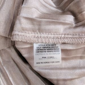 Gorgeous taupe/champagne colored velvet pleated dress with spaghetti straps, elastic waist, and flared skirt. Wear alone or add the sequin overlay top. Top can be worn with draped neck In front or back, so this dress gives you multiple looks.