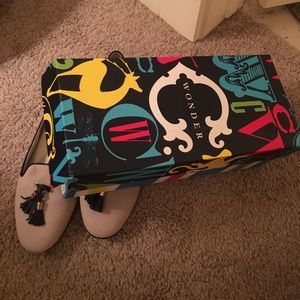 These have never been worn, brand new loafers from C. Wonder. Tassels are black and the shoe is taupe. Supportive insoles with padding. Awesome shoe. I would keep them but they are 1/2 a size too small for me.