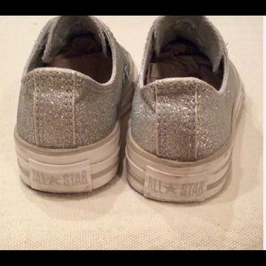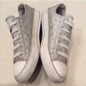 ๐Host Pick๐ March 21 Everything Kids Party! Woohoo!! Add some fun & pizzazz to your wardrobe with these Converse Silver Sparkle Sneakers Junior sz 1.5 in excellent pre-loved condition, used a handful of times for dance dress rehearsals then the recital. ๐Please see photos for condition with slight scuffs on rubber toe cap & sides. Thanks for shopping my closet!๐