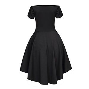 Super cute party dress, flirty off shoulder neckline, flattering high low hem, short sleeves, and an easy to wear fit and flare cut.