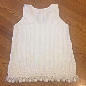 The Jaya Sweater is a cotton v-neck tank with fringe trim. This sweater tank with ribbing and baubles at the hem is a great addition to your wardrobe. This piece is is perfect condition. It is an XS and measures. 15 inches from underarm to underarm, 22 inches from shoulder to hem.
