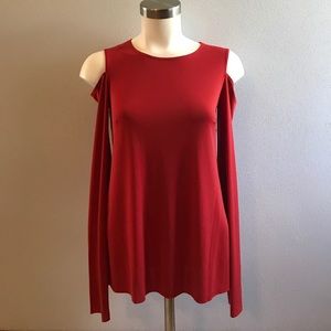 Bailey44 top, love the cut-out at the shoulders. Wore once. In great shape. Notice these faint lighter spots on the front, didn't notice with wearing. Dry clean only. May come out with getting cleaned.