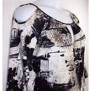 Off white, black, brown, & gray in color, keyhole neckline, roomy 3/4 sleeves with cold shoulders, abstract print throughout, straight hem, fabric is 96% polyester crepe knit, 4% spandex, machine washable. NWT Comes from a smoke free home. Measurements: bust-62 to 70 (stretched), sleeves-20, length-29 1/2.