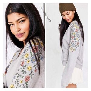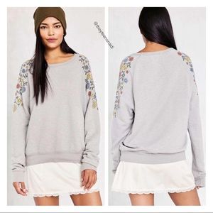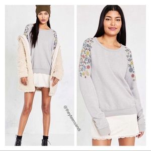 Soft + cozy pullover sweatshirt from Project Social T with pretty floral graphics at the shoulders. In a slouchy fit with long raglan-sleeves, a crew neck and banded hems. Cotton, polyester. Machine wash. Made in the USA. Measurements taken from size SMALL. Chest: 36". Length: 24". Color: gray. Purchased from Urban Outfitters.
