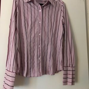 A New York & CO beautiful button down top. It is a Very light purple top, stripped down with with different shades of purple and pink. Material is stretch, 55% cotton, 22 % Nylon, 19% polyester, and 4% spandex. Contains all buttons, and in used great condition. Don't see no stains or holes. Comes from a pet and smoke free home.