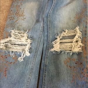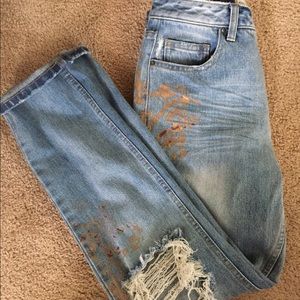 Distressed high waisted boyfriend jeans with gold stencil, excellent used condition. Size 26, waist laid flat is 14 inches, inseam (unrolled) is 28 inches.