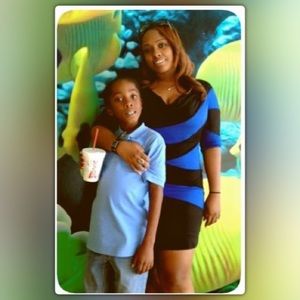 EUC! Fitted blue & black dress, knee length, 3/4 sleeve (covers the elbows), sassy swirl front design. 95% Rayon, 5% Spandex, so this dress is very forgiving. Pair with leggings or opaque hose with booties for this fall!! Wear with a cute jacket. See the first pic of me and last pic of me w/my youngest son! I'm wearing this dress.  To give an idea of the fit and length! I'm 5'2 in height so if you're taller, this could serve as a tunic/top! (See other listing for shawl collar black jacket! )