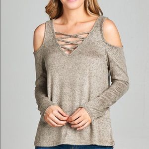 On trend long sleeve, cold off shoulder top and Criss cross detail. Made of rayon, poly and spandex blend. Size S, M, L.