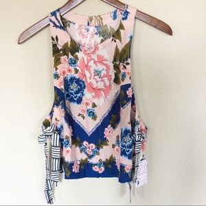 Channel your inner boho babe with this Free People sleeveless cropped tank, featuring flirty florals and an open side-tie silhouette.