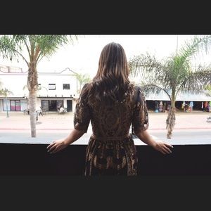Make heads turn in this sheer black maxi dress with colored/gold floral detailing😍 the maxi dress features a daring slit in the bottom on both sides and a gorgeous GORGEOUS back detail 👌🏽 This dress sold out and has been re cut with a gorgeous empire waist detail. Get it before it sells out again! This is perfect for festival season and Spring Break🖤