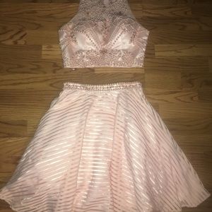 Pearl and jewel beading against a soft pink/blush satin like material. Perfect for homecoming, prom, or any party. Back is sheer and fully beaded