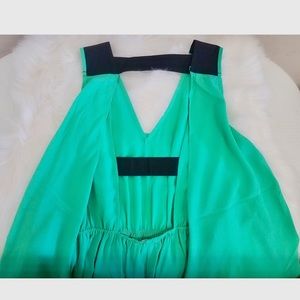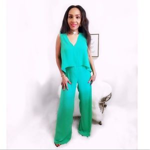 This flowy sleeveless woven jumpsuit features contrast colored straps and flounce layer on bodice. Pants have a wide-legged fit.