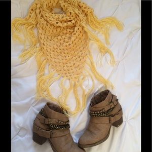 Congrats, you just met your new favorite scarf! This trendy beauty is the perfect piece to tie any fall outfit together and the sweet honey like color is simply stunning. Handmade with love! Also available in blue.