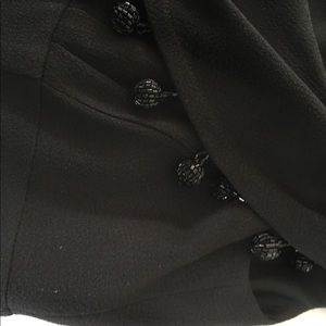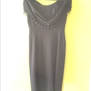 This is a black acetate and polyester dress with beaded neckline. See photo. It was worn once and dry cleaned afterwards.