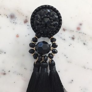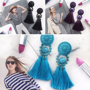 Bold, daring, & vibrant, the "Mila" fringe tassel statement earrings are perfect for a boho music festival. They feature geometric patterned black acrylic circles with black thread/string fan tassels dangling from a loop of dainty gold & black beads. The gold colored beads & small metal hoops are zinc alloy. They are lightweight stud earrings with push backs. New with tags & protective packaging. Available in additional colors in separate listings.