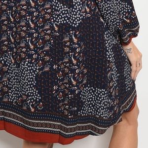 Long sleeve multi color and multi print shift dress with scoop neckline and strap details.