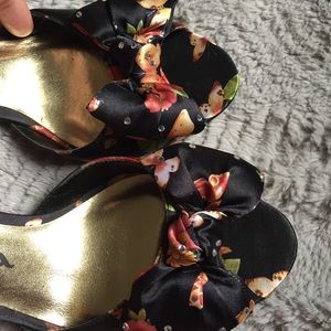 Perfect for date night brand New never worn black Floral satin heels with a bit of bling on the super cute bows. Would look amazing with a little black dress and red lips!
