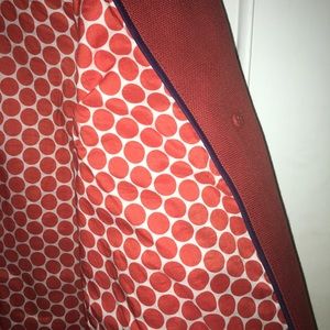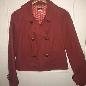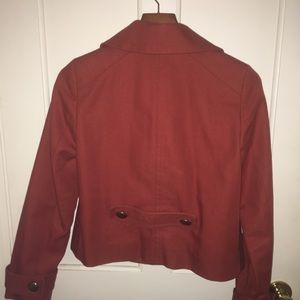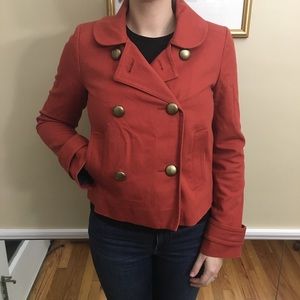 Great canvas jacket in rust colored orange. Fully lined with cotton print and blue grosgrain trim. Big brass buttons on front, cuffs, and back detail. Like new!