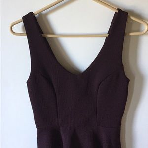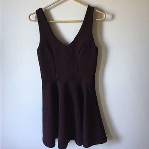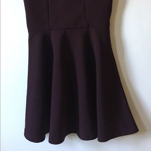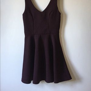 Excellent condition. Solid maroon color. Material has pattern. Slips over head. No zipper. Sleeveless. Some stretch. V neck and back. Fitted bodice, flair bottom. Bodice is lined. Size 6. 98% polyester, 2% elastane. Machine wash, line dry. About 15.25" from armpit to armpit. Waist about 26". About 32" long from top of shoulder. M33
