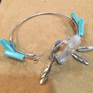 Iridescent crystal turquoise color stone, silver tone feathers & bracelet. Bracelet is 3.75" opening. In excellent new condition with NO damage. NWT