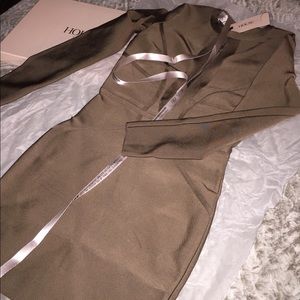 With her peek-a-boob bustline and slightly military vibe. Bandage fabric that caresses your curves, 'Kesor' features incredibly flattering panelling to give you that hourglass figure. Round neck, long sleeves and an over the knee cut finish off this perfect look.