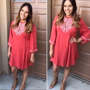Bohemian Embroirdered Keyhole Dress. Love this piece super outgoing & cute! 75% Cotton 25% Polyester lining MEASUREMENTS. MEDIUM: Sleeve 18 in, shoulder-shoulder is just over 15 in, shoulder-bottom is Dress 34 in, waist 17 1/2 in. LARGE: 33 length of dress, 18 in waist, 18 in Sleeve, 16 in shoulder to shoulder.