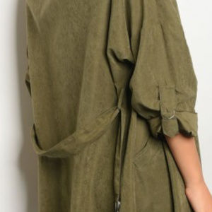 So Soft and Chic this olive green faux suede belted duster jacket features classy wide lapel neckline, soft feel and pockets.