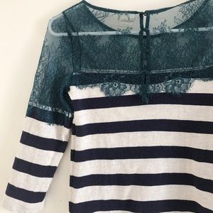 The prettiest Anthropologie Lace Striped blouse. This top is extremely versatile, so easy to dress up or down! Looks really cute with a high waisted mini skirt. The top is a sheer teal/turquoise lace, while the body is a soft knit navy blue and cream color. Body and sleeves are 100% cotton. Lace is 100% Nylon! NWOT, Never worn. Size XS 🌼 Brand Deletta