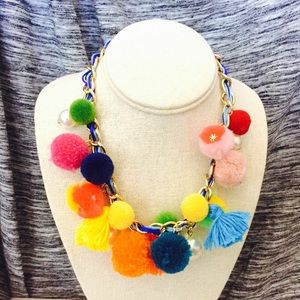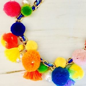 Beautiful and very fun Pom Pom and Tassel necklace. 16" with adjustable clasp. Throw this on a simple outfit for a Statement and fun accessory. No Trades, reasonable offers only.