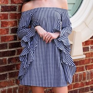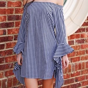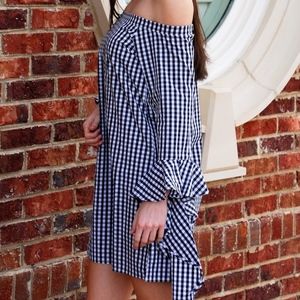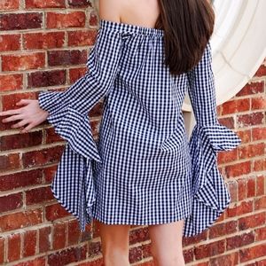 What's more fun than a bold, black and white gingham check dress? How about one with that's off the shoulder with a trendy bell sleeve! It has a comfortable fit and looks great with black heels or a simple sandal. Style fits true to size. Sarah is wearing a small. Sarah's height 5'5"