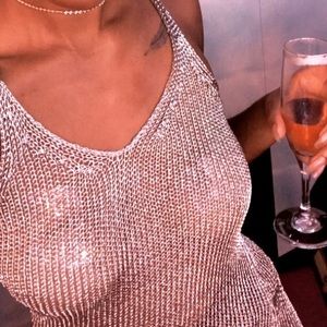 Ready for another head turner? This gold/metallic sleeveless dress will definitely have everyone asking "Who is that?"...this dress is a XS but can easily fit a woman up to a M. You will need pasties and a undergarment. (Worn Once)
