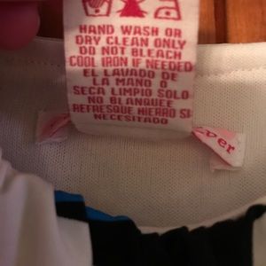 Banded bottom, adjustable straps, padded cups, pockets on the sides! Absolutely flowing! Wear it or without a black shrug?! Don't miss this one! The background is mostly white with gray, black and royal blue throughout.