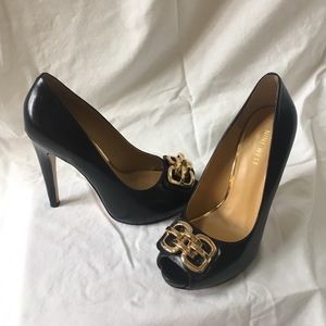 Black Nine West peep toe heels with gold embellishment/buckle at the end; 4.5" heel only worn once
