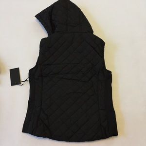 Black quilted polyester vest. Faux shearling lining along zipper areas to keep the warm in! Pockets. Hood with button neck closure.