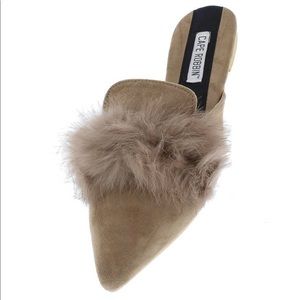Pointed mule flat. Fur detail across toe. Faux suede material. Neutral taupe color. Perfect Fall staple. Sizing fits true. Brand new in box, box included.
