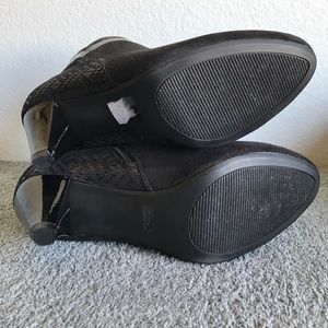 New in box. 2.25" Heel. Black Fabric Faux Suede. Right shoe zipper is damaged, piece broke off but is still functional to open and close zipper.