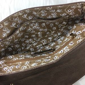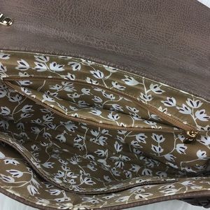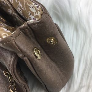 Woven-front clutch. Light brown. Removable (faux) gold chain strap. (Faux) gold closure - see 4th image for a close up of closure - scratch damage. Snaps at tops of each side to narrow the top depth if desired. Lined interior. Zip pocket. Two open pockets opposite of zip pocket. About 11” wide, 6” High. In great condition.