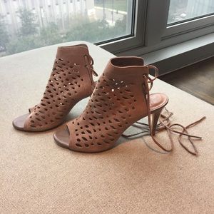 Tan suede cutout booties. 4" heel. Bought at Shopbop for $335 + tax.
