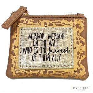 This fully lined premium vegan leather Coin Purse is the perfect accessorie to hold all of your excess change or cash in. With its internal fabric lining, and its soft shell vegan leather, this piece is useful and stylish. Printed on front with a true to storybook design "Mirror Mirror on the wall who is the fairest of them all?" Quote says it all.