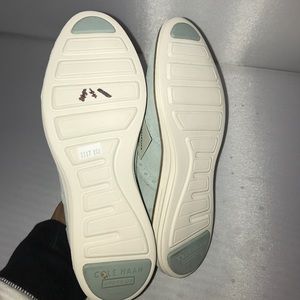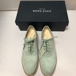 Just In! 4 more pairs! These Cole Haan Wingtip Oxfords feature a seafoam green waterproof nubuck upper, Lace Up closure, round toe, off white soles and comfortable inner soles.