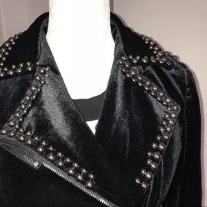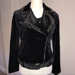 This velvet moto jacket is absolutely stunning! Features a moto design, zips at sleeves, belt at waist, zip pockets at sides, and stud detailing on the collar and back panel. Medium weight, Fabric: 100% Polyester. Machine wash!