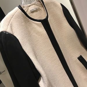 Dropped shoulder seams accentuate the relaxed fit of a textured-knit alice + olivia jacket. Contrast leather banding trims the zip hip pockets and placket. Elbow-length leather sleeves. Lined.