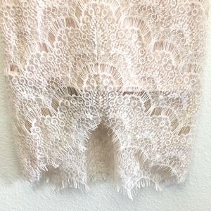 Beautiful lace dress perfect for a holiday party/cocktail dinner or just a night out - Excellent condition, used a couple of hours only - No Defects - Bodycon with scalloped boat neck - frayed cap sleeve, and asymmetrical hem with sides longer than center - Lining has sweetheart neckline - Slip on style.