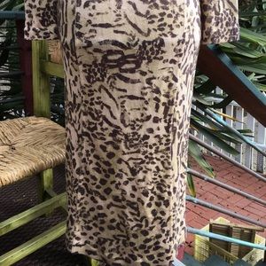 Beautiful and well constructed wool blend tan and brown animal print duster coat with front pockets, removable belt, padded shoulders by St. John by Marie Gray.