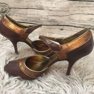 Prada Vintage Brown Sequin PeepToe Heels Sz 37 1/2