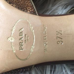 Gorgeous vintage Prada heels in brown leather. Decorative perforations on the toe and heel covering & adorned in gold sequins. Ankle straps have a brown tortoise look button. Interior of the shoes is gold leather, bottoms show very little wear. No missing sequins, leather wrapped heels are not scuffed. Very small blemish on the edge of one heel as shown otherwise perfect condition. Size 37 1/2.