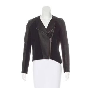 Beautiful suede leather black moto jacket with jersey panels. A real stunning piece. Edgy yet classic. Long sleeves, dual pockets and asymmetrical zipper. Very good condition.